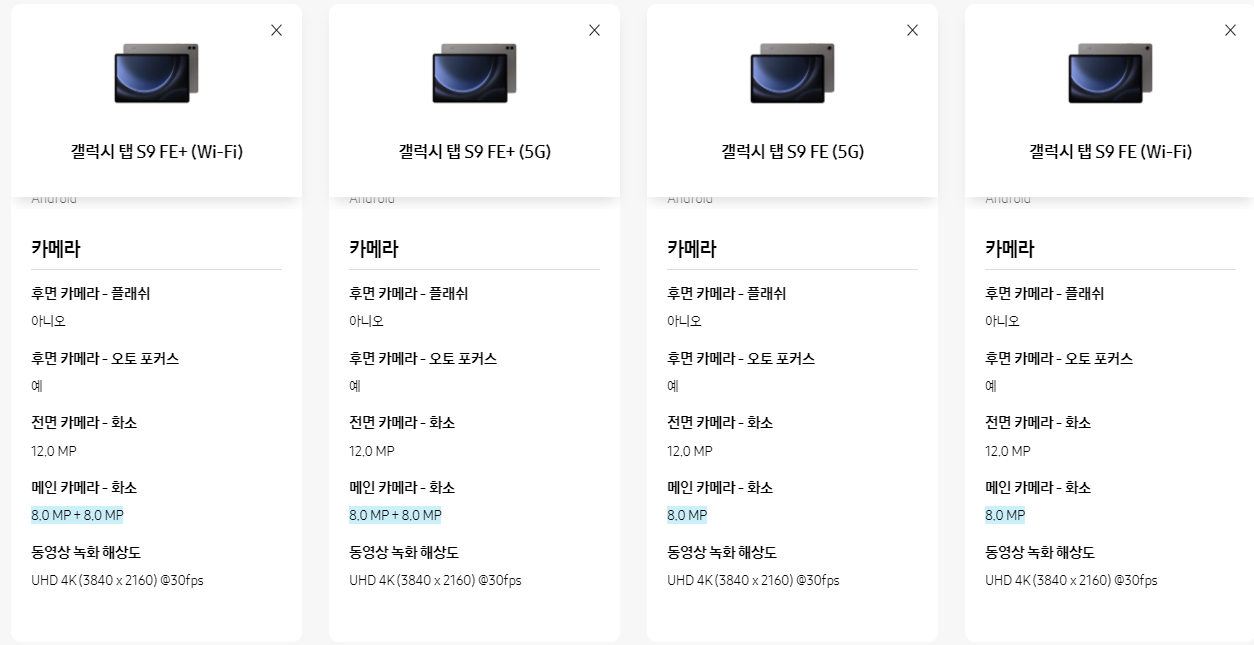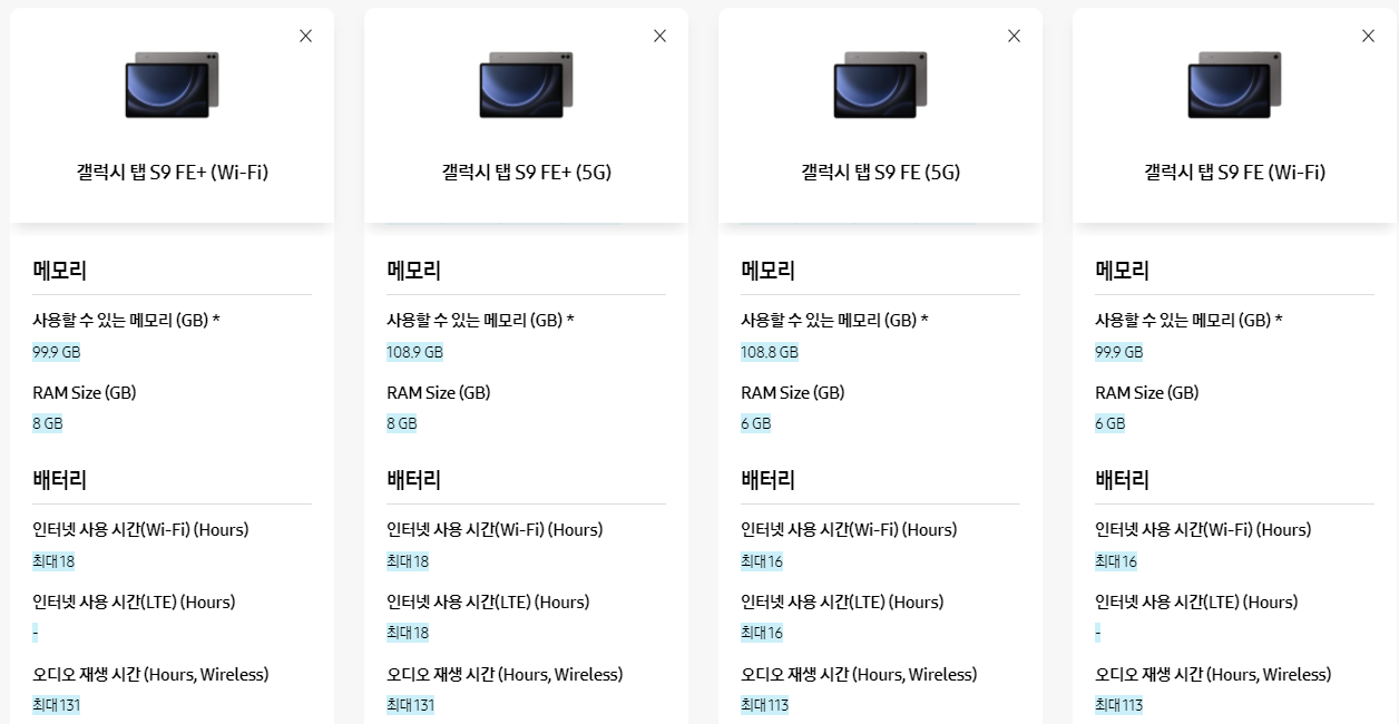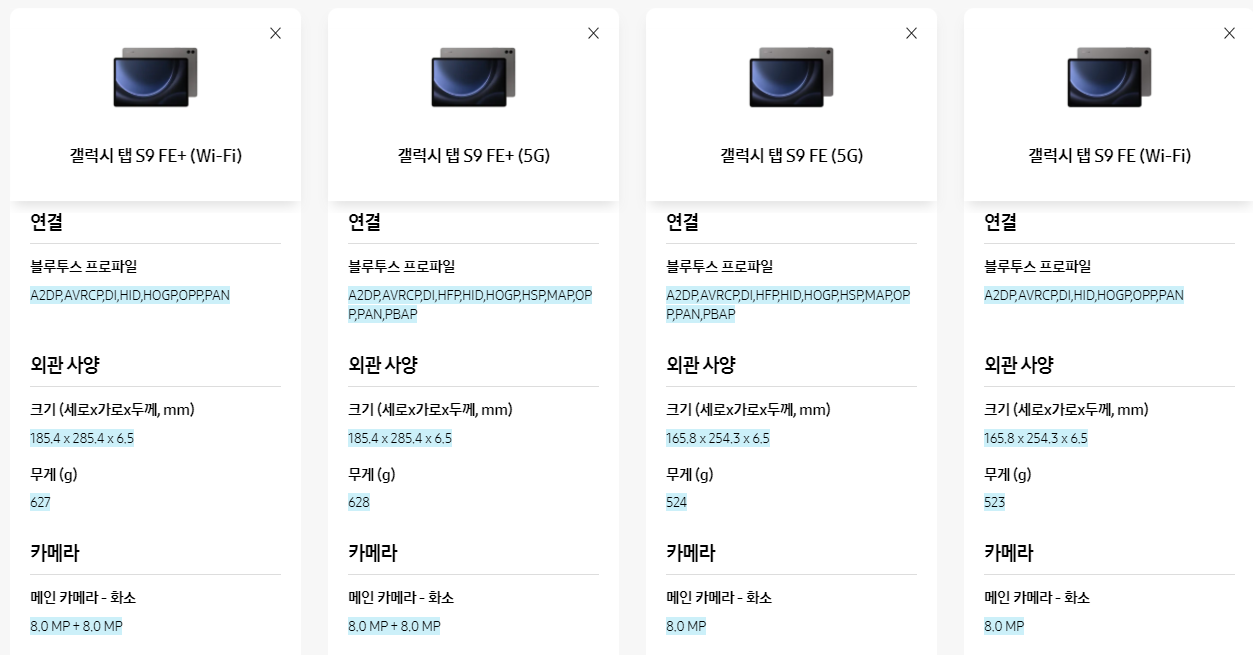 갤럭시 탭 S9 FE / FE+ (WIFI / 5G) 비교
