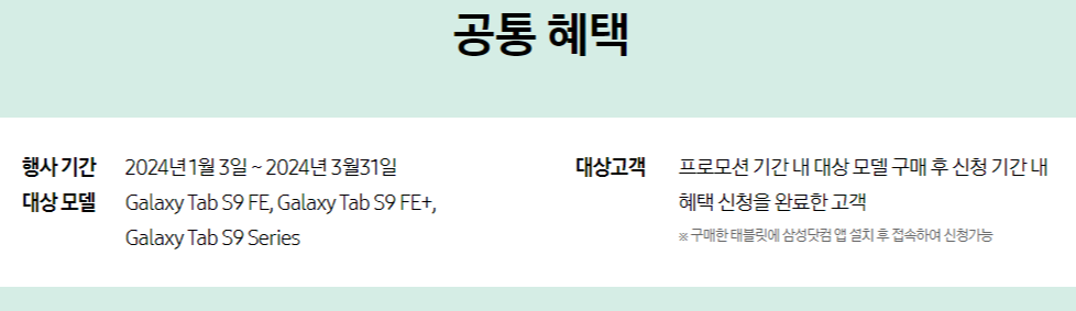 갤럭시 탭 S9 FE 시리즈는 삼성닷컴 단독혜택은 물론 어느 곳에서 구매해도 적용되는 공통혜택도 다양하게 제공됩니다.