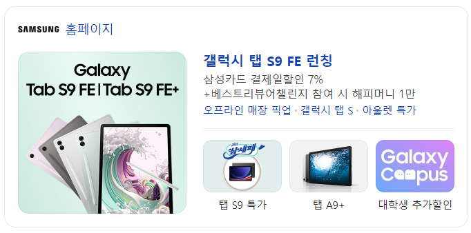 | 갤럭시 탭 S9 FE | 539,200원 | 689,700원 |