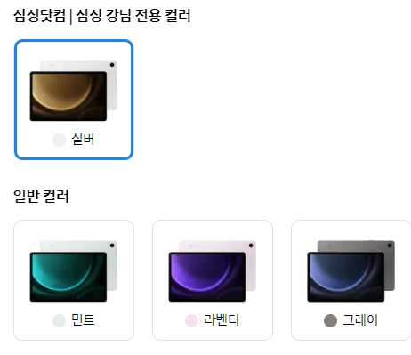 갤럭시 탭S9 FE 시리즈의 색상은 총 4가지 색상으로 실서(삼성닷컴 전용컬러), 민트, 라벤더, 그레이가 있습니다.