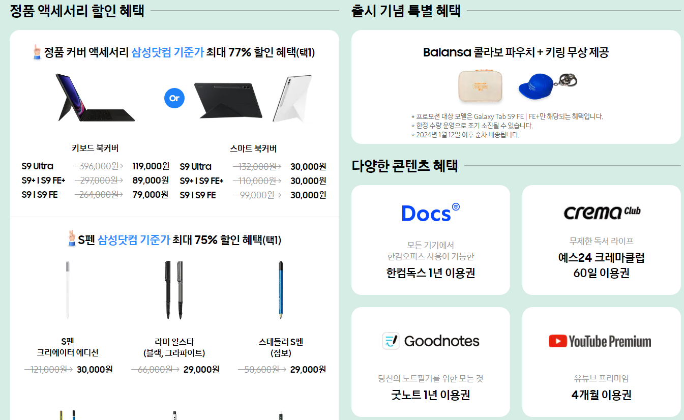 갤럭시 탭 S9 FE / FE+를 고려하고 계신다면, 이번 런칭 및 출시 기념 혜택을 통해 더욱 합리적인 가격에 구매하시기 바랍니다.