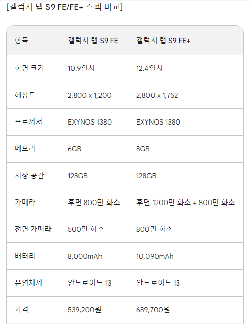 | 갤럭시 탭 S9 FE+ | 689,700원 | 839,200원 |