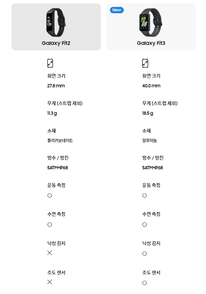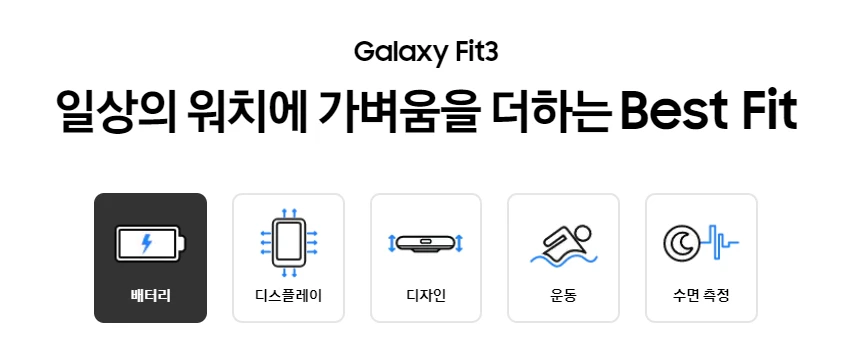- 5ATM 및 IP68 등급: 갤럭시 핏3는 5ATM 등급 방수와 IP68 등급 방수·방진을 지원해 사용자가 보다 다양한 환경에서 활동을 즐길 수 있도록 해줍니다.