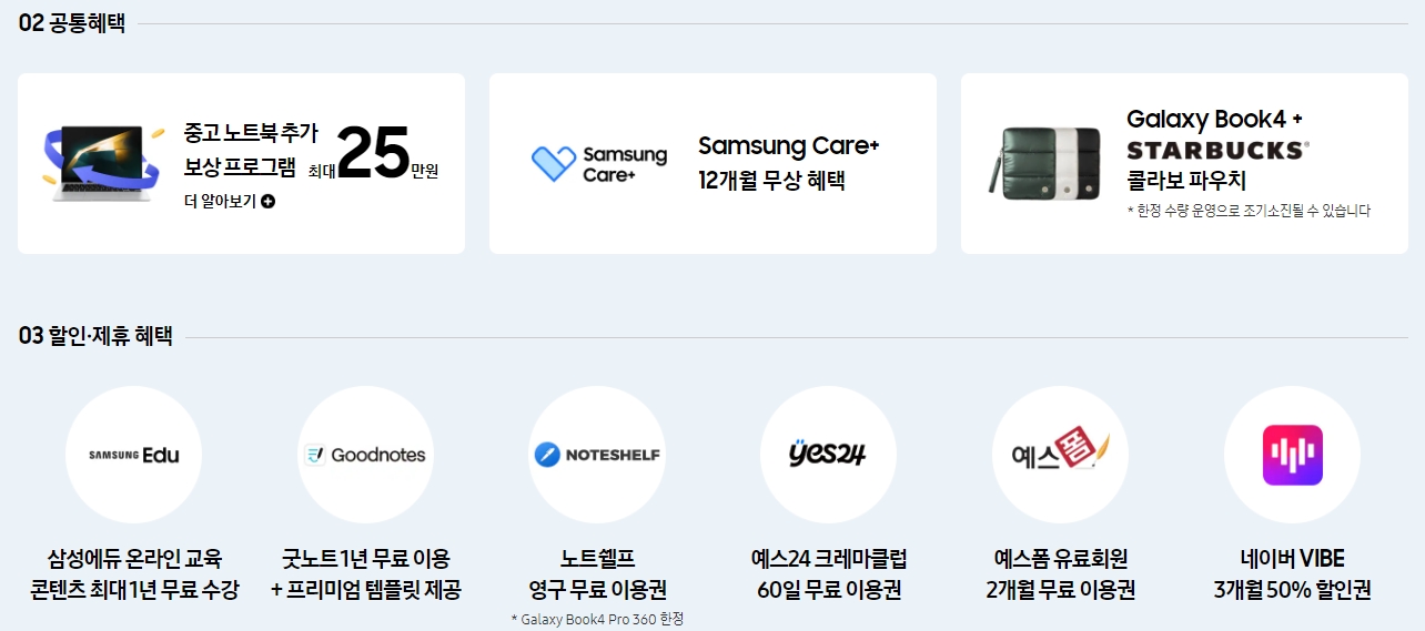 - 혜택내용: 스타벅스 콜라보 파우치 증정, 삼성케어플러스 1년무상, 온라인교육 콘텐츠 제공 등