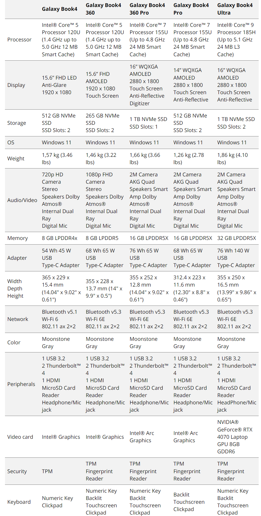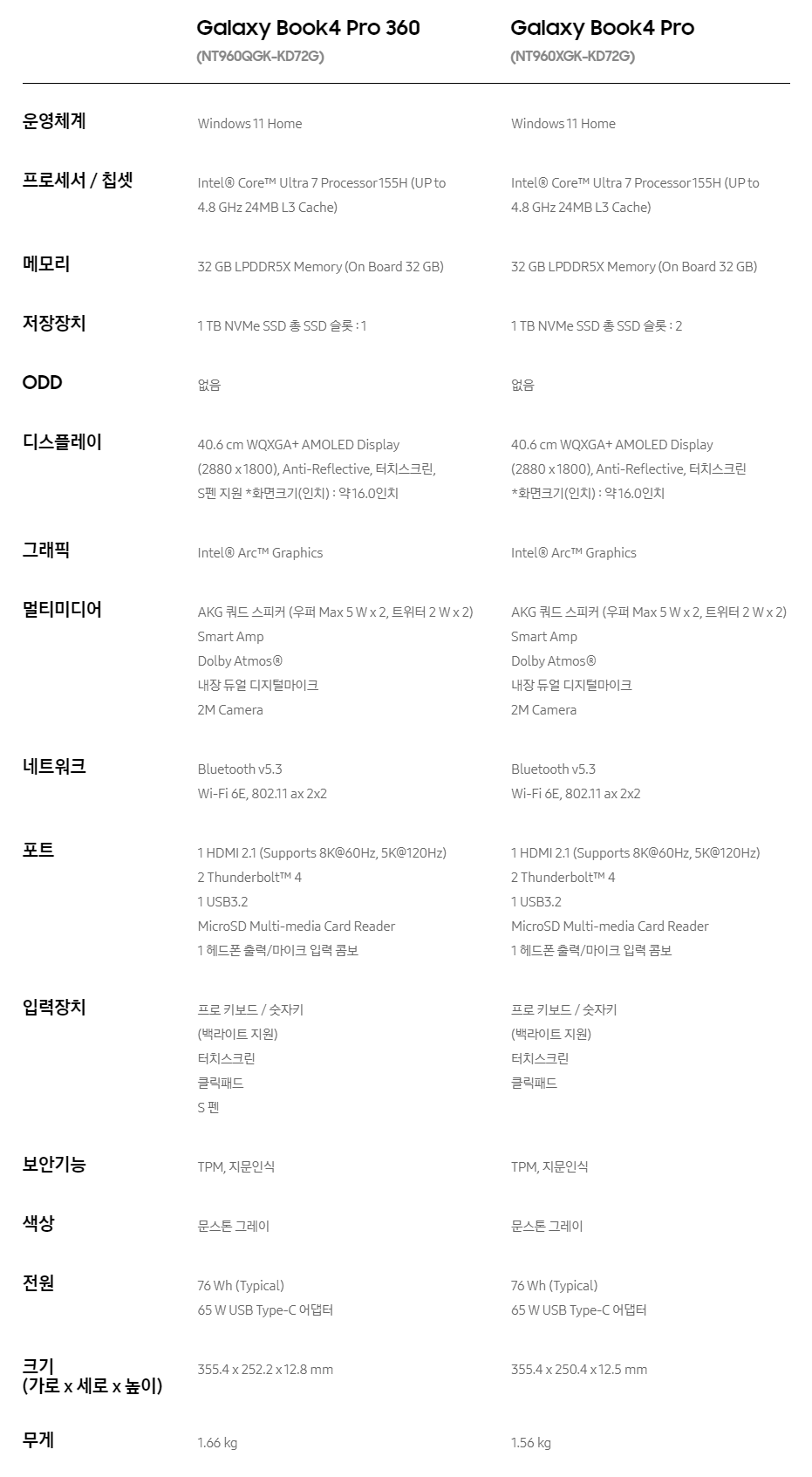 | 갤럭시북4 프로 | Intel® Core™ Ultra 9 Processor 185H ~ Intel® Core™ Ultra 9 Processor 285H | NVIDIA® GeForce RTX™ 3050 Laptop GPU ~ Intel® Iris Xe Graphics | 8GB ~ 16GB LPDDR5X | 512GB ~ 1TB NVMe SSD | 188만원 ~ 289만원 |