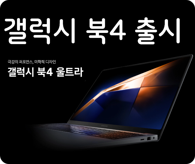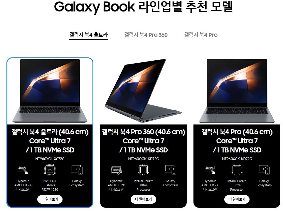 | 갤럭시북4 울트라 | Intel® Core™ Ultra 9 Processor 185H ~ Intel® Core™ Ultra 9 Processor 285H | NVIDIA® GeForce RTX™ 4070 Laptop GPU ~ NVIDIA® GeForce RTX™ 4050 Laptop GPU | 64GB ~ 128GB LPDDR5X | 1TB ~ 2TB NVMe SSD | 336만원 ~ 509만원 |