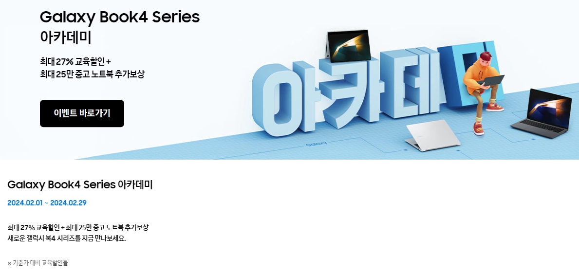 - 갤럭시캠퍼스 단독 추가혜택: 최대 27% 교육할인 + 최대 25만원 중고 노트북 보상