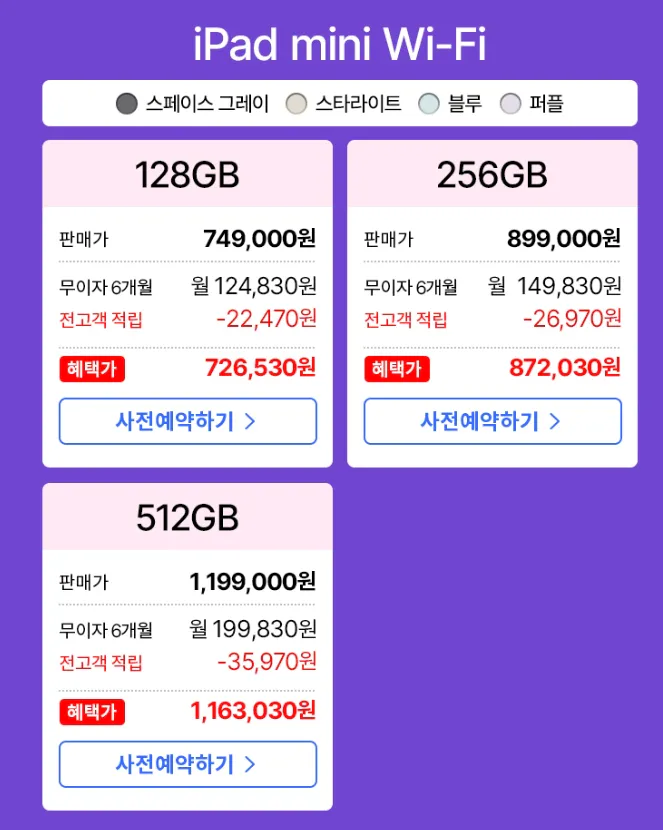 아이패드 미니 7세대의 가격은 기본 모델 기준으로 약 749,000원부터 시작합니다. 출시일은 2024년 11월 21일로 예정되어 있으며, 사전예약은 11월 20일까지이며 11월 21부터 배송이 시작됩니다. 가격대가 다소 높지만, 성능과 디자인을 고려했을 때 충분히 가치 있는 선택이 될 것입니다.